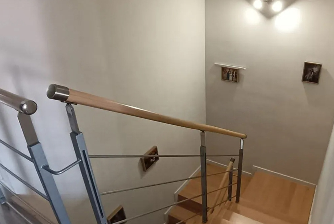 Suelos en parquet AC7 tono roble viejo la mayoría de las estancias, en haya la escalera con su barandilla de inox moderna. Baños y cocina en gres y mármol.